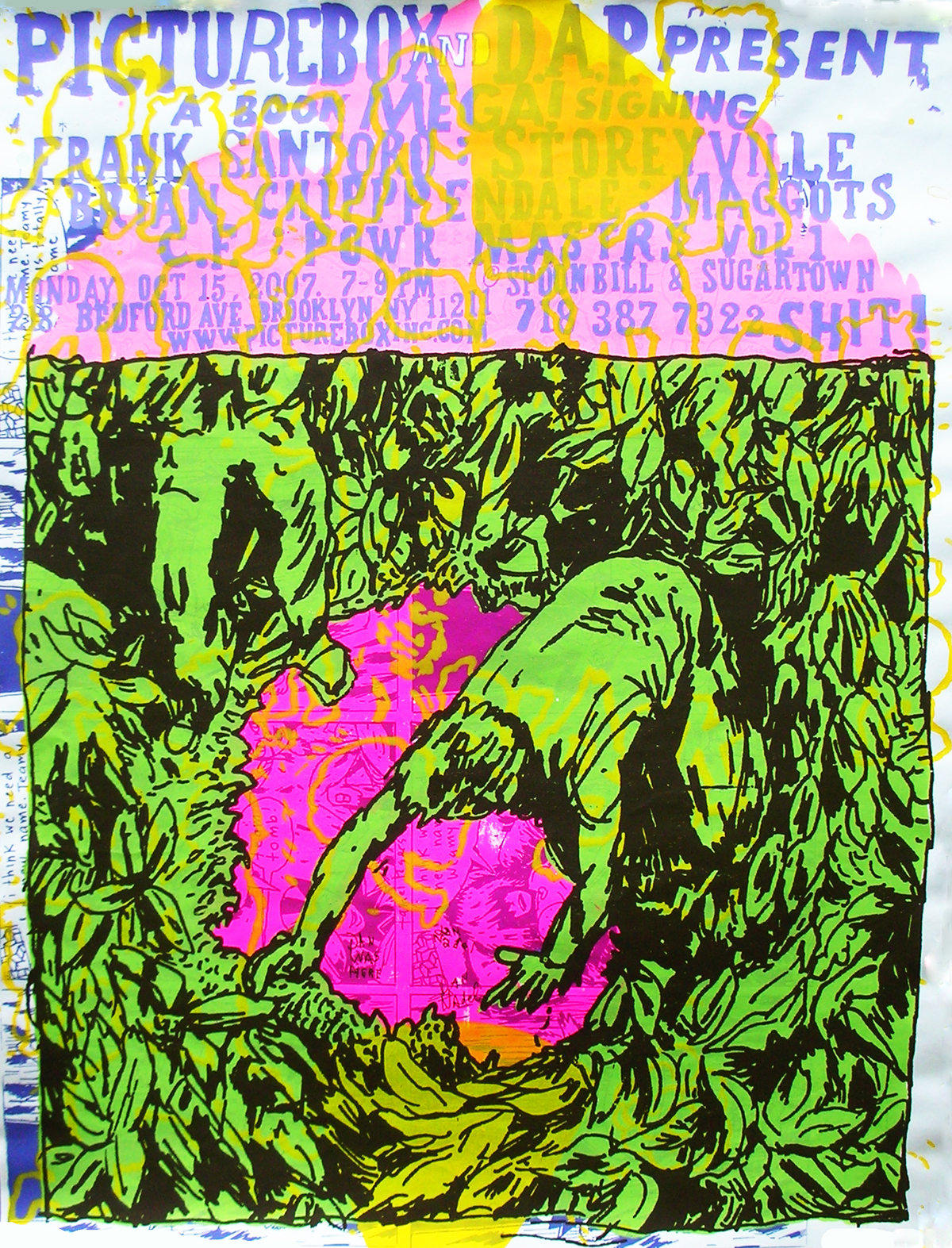 7 color silkscreen. This is a monoprint, with a few extra layers more than the sold out edition. 26"H x 20"W. This is for a Brooklyn signing featuring Picturebox artists Brian Chippendale, CF and Frank Santoro. Printed in 2007. Designed and handprinted by Brian Chippendale.