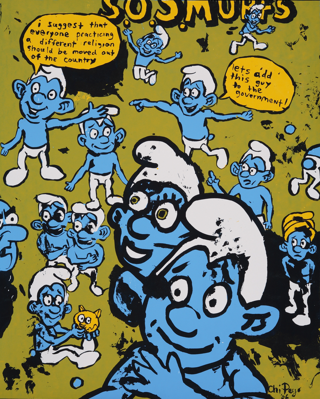 3 color silkscreen. Smurfs! 20.5" H x 16.5" W. 1 available from the edition of 40. Printed in 2006. Designed and handprinted by Brian Chippendale.
